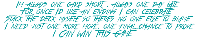 "I'm always one card short, always one day late, for once I'd like an ending I can celebrate, stack the deck myself so there's no one else to blame, I need just one more move, one final chance to prove, I can win this game."